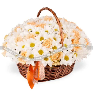 Нежность чувств - корзина с кустовыми хризантемами и розами