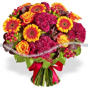 Октябрь - букет из желтых хризантем и красных гвоздик