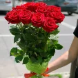 Роза красная 70 см - 21 шт, упаковка, лента. На фото представлен букет из 9 роз.