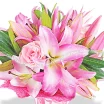 Уменьшенный: лилия розовая (возможна замена на белую) - 1 шт., роза розовая - 3 шт., натуральная упаковка - розовая.