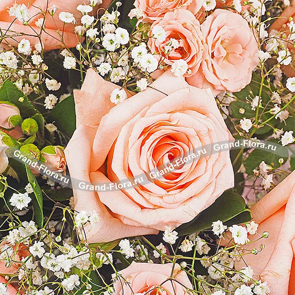 Утонченная композиция из нежно-розовых кустовых и обычных роз в сочетании с рускусом и милейшей гистофилой.