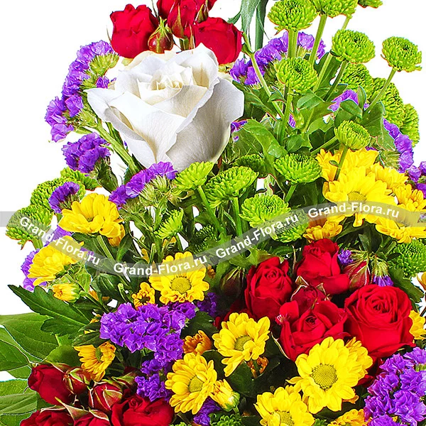 ЛЮКС: роза белая (70см) - 3 шт., роза красная кустовая - 5 шт., хризантема желтая ромашковидная - 5 шт., хризантема зеленая кустовая - 4 шт., статица - 4 шт., салал, сетка.