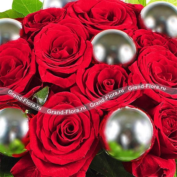 17 роз: 17 красных роз (70см), новогодний декор и зелень, сетка.