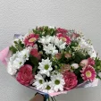 роза розовая - 7 шт, роза кустовая розовая - 2 шт, роза кустовая белая - 1 шт, фрезия(альстромерия) фиолетовая - 2 шт, фрезия(альстромерия) белая - 2 шт, эустома белая - 3 шт, декоративная зелень, фетр фиолетовый. Примерный размер: 35Х35 см. Букет представлен на фото