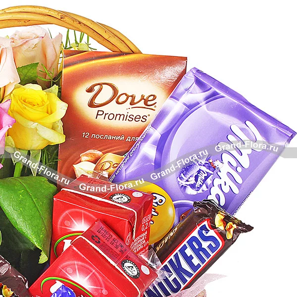 Уменьшенный: шоколад "Milka" - 1 шт., Snikers - 1 шт., шоколад Чудо - 1 шт., шоколад DOVE (12 пожеланий) - 1 шт., Milky Way - 2 шт., Bounty - 2 шт., розы (20 см) - 5 шт., оазис, декор, корзина малая.