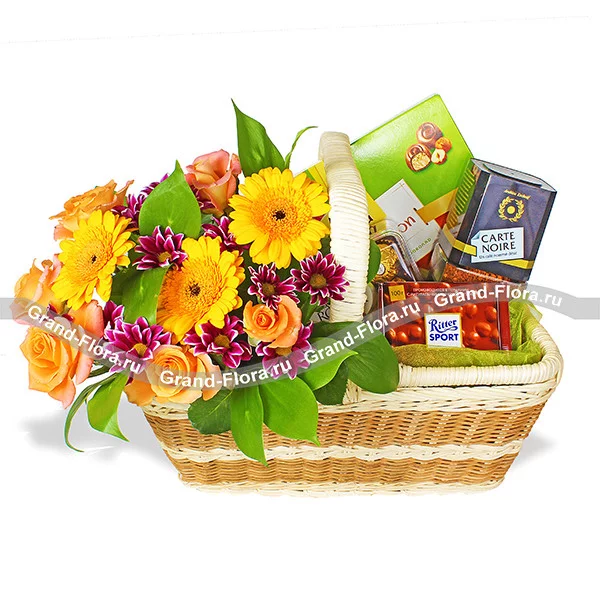 Стандартный: герберы - 3 шт., розы (микс) 20 см - 6 шт., хризантемы - 2 шт., шоколад "Ritter sport" - 1 шт., конфеты "Ferrero Rocher" - 1 шт., конфеты "Alpen Gold" - 1 шт., кофе черная карта - 1 шт., декоративная зелень, оазис, корзина средняя, фетр.