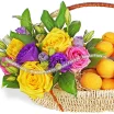 Уменьшенный: роза желтая - 2 шт., роза розовая - 1 шт., эустома фиолетовая - 1 шт., рускус - 1 шт., оазис, корзина малая, абрикосы - 1 кг.