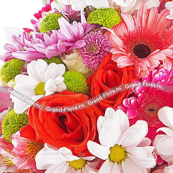 Роза розовая - 5 шт., роза белая - 5 шт., роза красная - 6 шт., гербера розовая - 3 шт., гербера малиновая - 4 шт., хризантема кустовая (белая и розовая) - 7 шт., хризантема кустовая зеленая - 4 шт., хризантема одноголовая белая - 3 шт.,  альстромерия (белая и розовая) - 4 шт.,   статица - 3 шт., фетр фиолетовый.