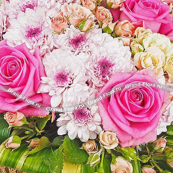Роза розовая - 15 шт., роза кустовая розовая - 10 шт., хризантема кустовая светло-фиолетовая - 10 шт., лист аспидистры загнутый - 8 шт., упаковка натуральная.