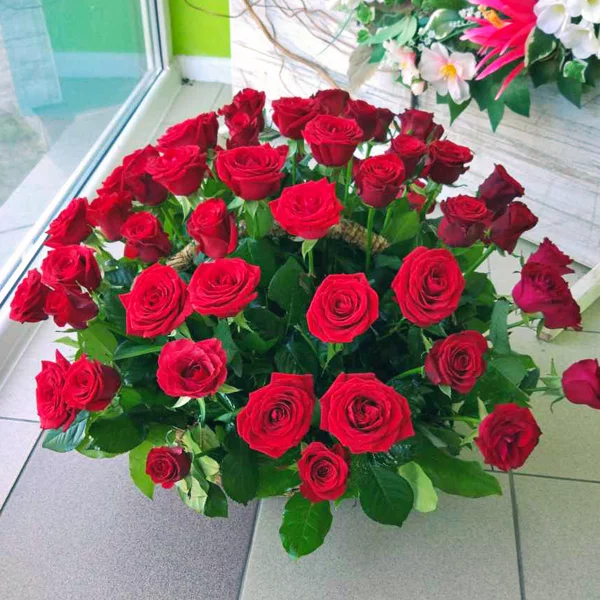 101 роза: роза красная - 101 шт., оазис, корзина.