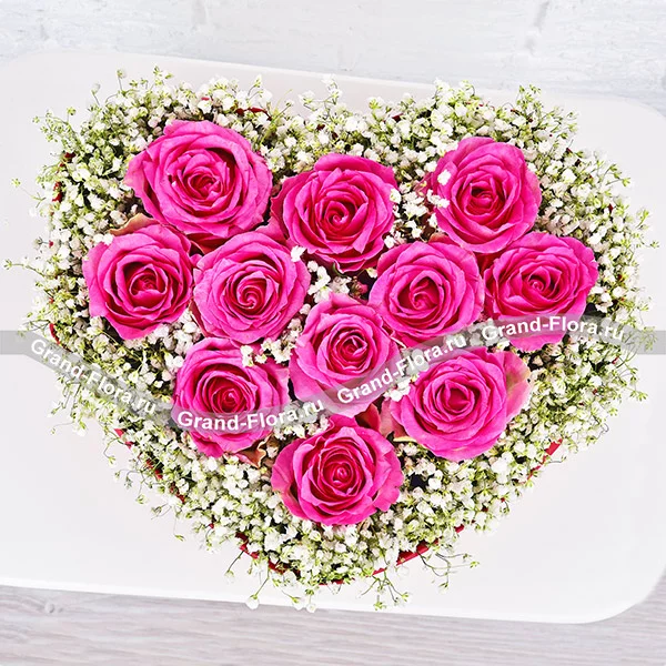 11 роз (на фото): роза розовая - 11 шт., гипсофила, оазис сердце малое. Примерный размер: 25Х25 см.