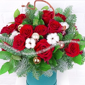 Стандартный: роза красная - 1 шт., мандарины - 2 шт., эвкалипт - 1 шт., хлопок - 1 шт., шишки - 2 шт., корица, шарик, ель, оазис, коробка.