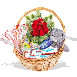 Стандартный: роза розовая - 7 шт., ель, шарики - 5 шт., оазис, коробка.