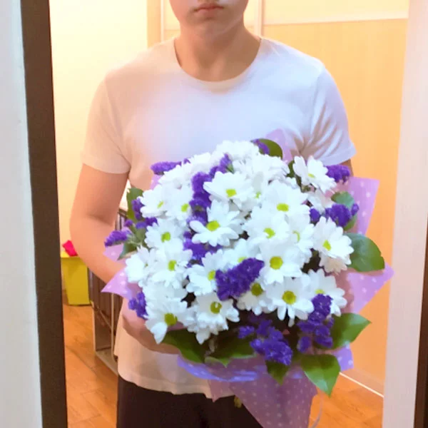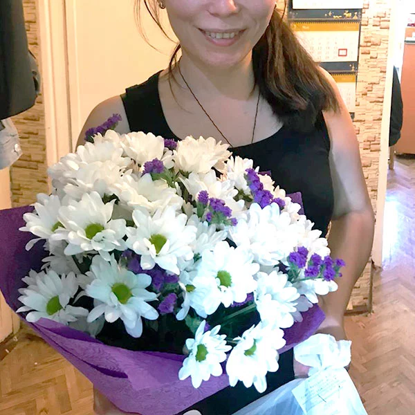 Искал букет с ромашками, нигде не мог найти. Когда позвонил в службу, мне пояснили, что в это время года ромашка не поступает в магазины, но кустовые хризантемы ничем не отличаются от ромашки. Выбрал этот букет в люксовом варианте, смотрится очень достойно. Рекомендую.