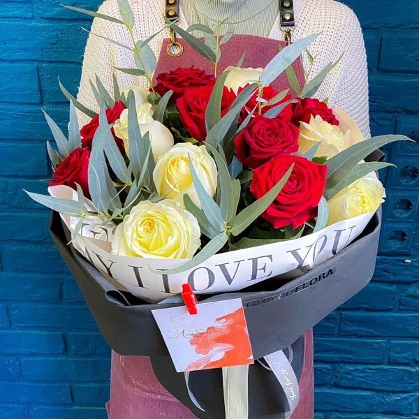 Букет из красных и белых роз, гармонично дополненный эвкалиптом, станет отличным поздравлением как для женщин, так и для мужчин.